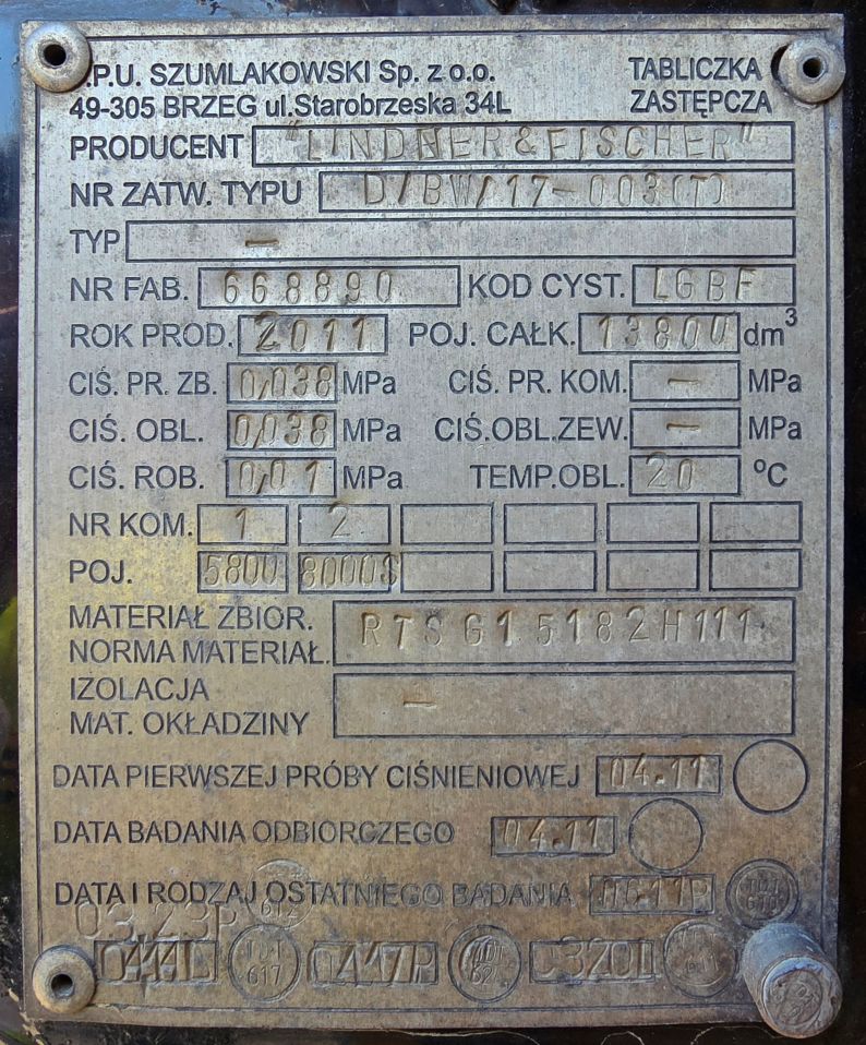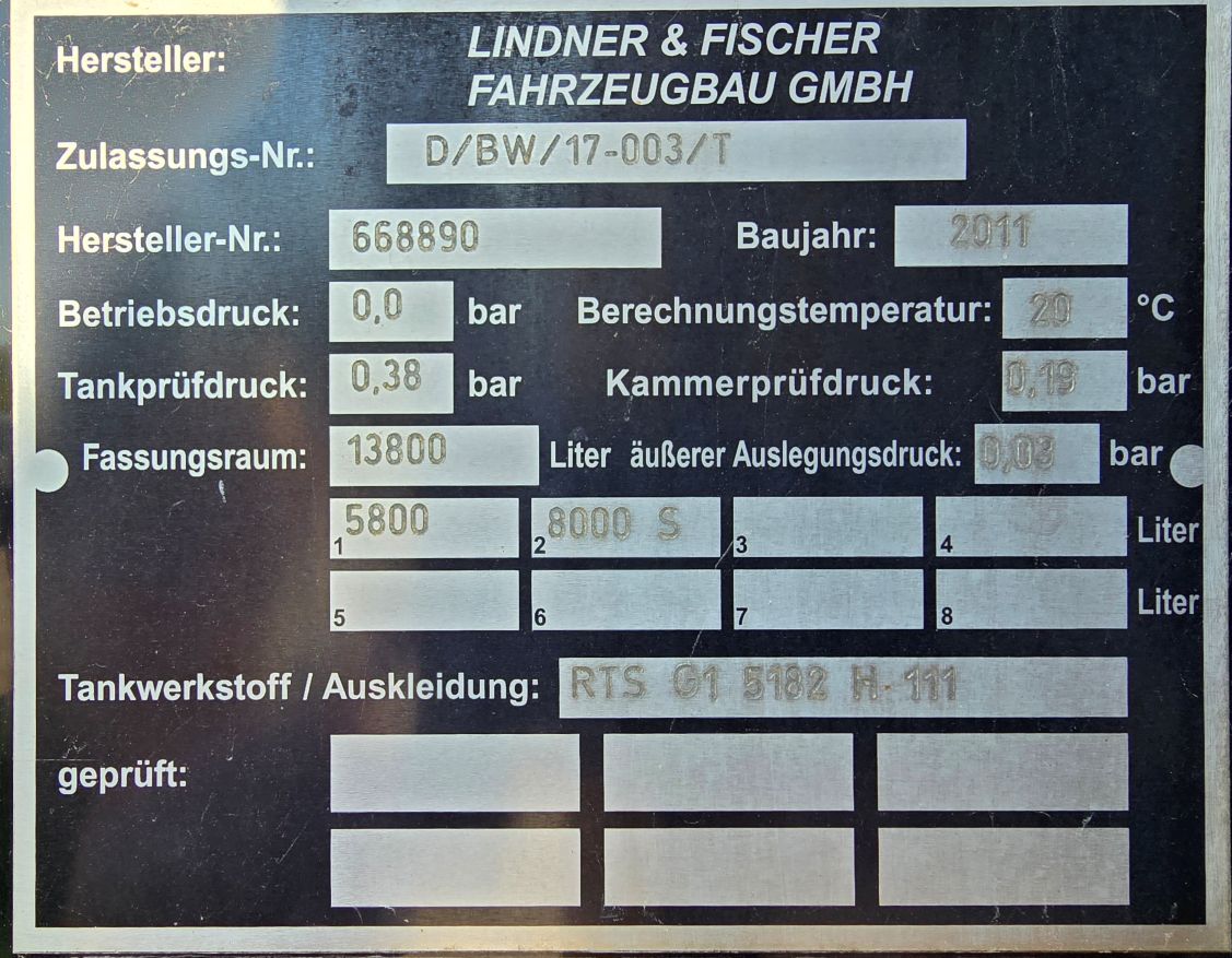 Wielkość zbiornika: 13.800 l (dwie komory 5800 / 8000 l) / pojemność użytkowa: 13.100 l (5500 / 7600 l)